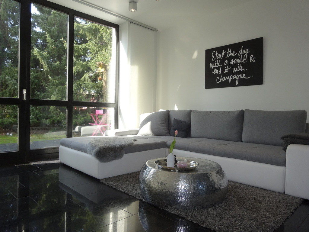 Das Wohnzimmer mit der 4m breiten, bodentiefen Fensterfront und der daran angrenzenden Terrasse ist das Highlight des Apartments. Das chillige Ecksofa lässt sich einfach zu einer Schlafcouch umfunktionieren und bietet so einen Schlafplatz für 2 Personen (Liegefläche 240x130).