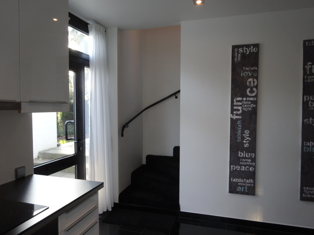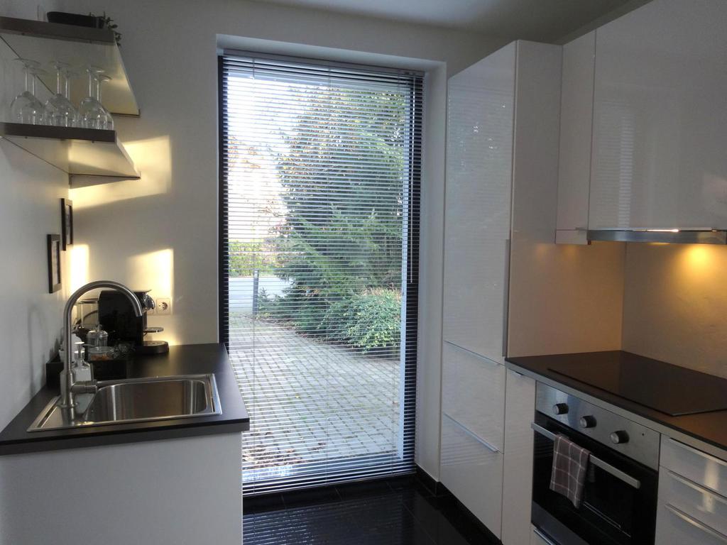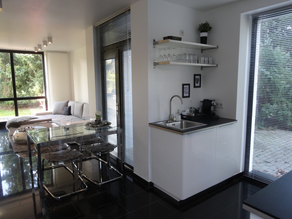 Im Erdgeschoß befindet sich eine moderne, offene, weiße Lackküche mit Cerankochfeld, Backofen, Kühlschrank mit Gefrierfach, Spülmaschine, Wasserkocher und einer Nespresso Kaffeemaschine. Die Küche ist ausgestattet mit farblich passendem Zubehör wie z.B.: Geschirr, Gläser, Besteck. Pfannen, Toaster, usw...