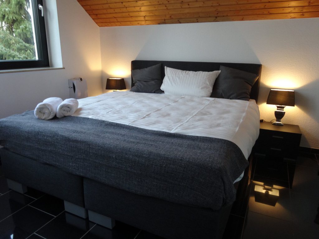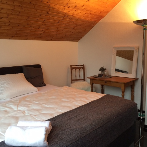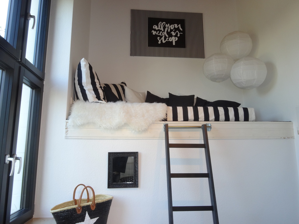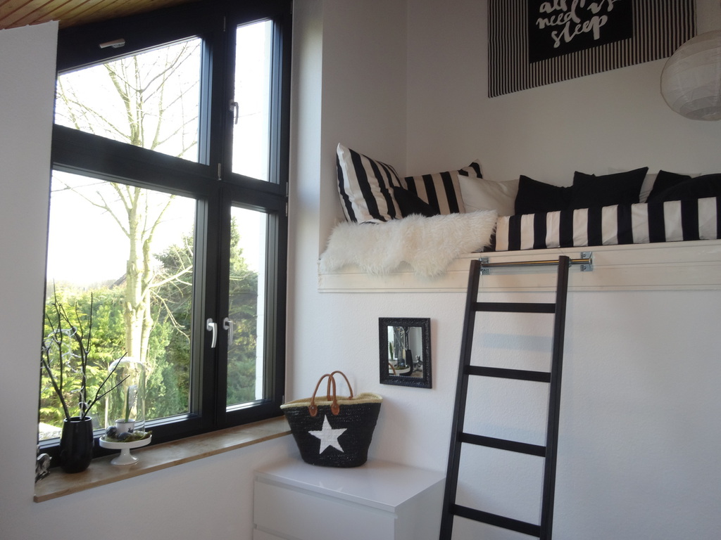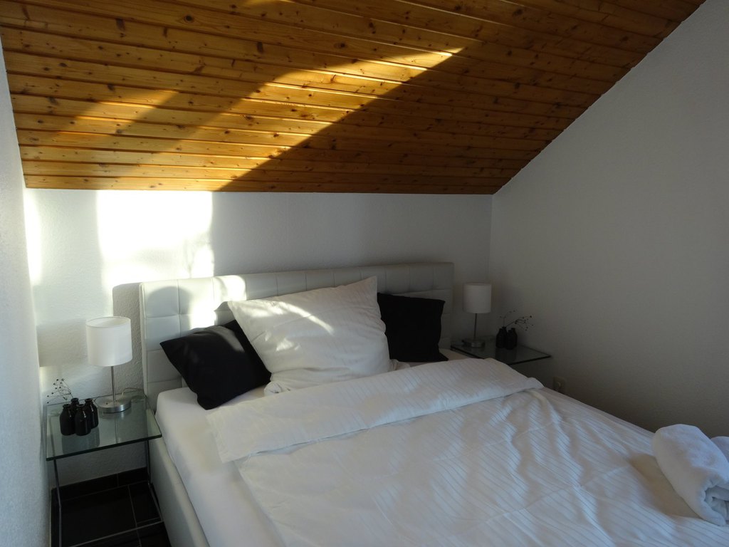 Das kleinere Schlafzimmer verfügt über ein grosses Bett (Matratzenmaß 160x200) und eine Kommode. Eine kleine Empore bietet Platz zum Chillen und Lesen.