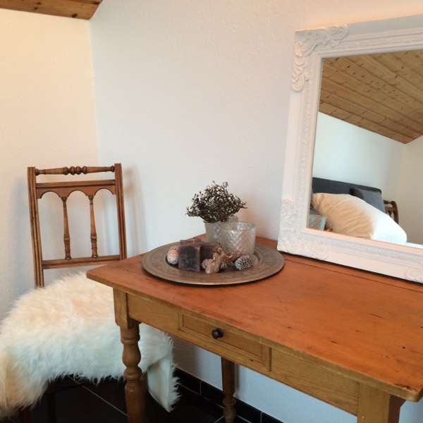 Das grosse Schlafzimmer besticht durch seine fast 5m hohe Decke und verfügt über ein modernes Boxspringbett (Matratzenmaß 180x200) und einen 3m Kleiderschrank. Ein antiker Tisch mit passendem Stuhl kann als Schmink-oder Schreibtisch genutzt werden.