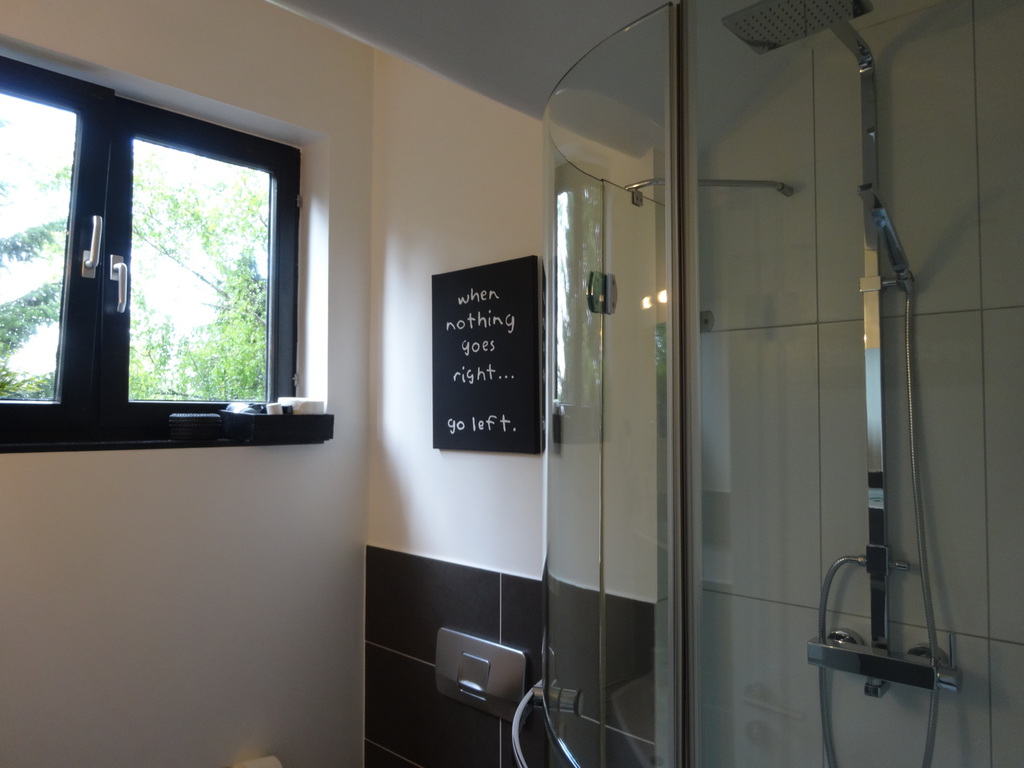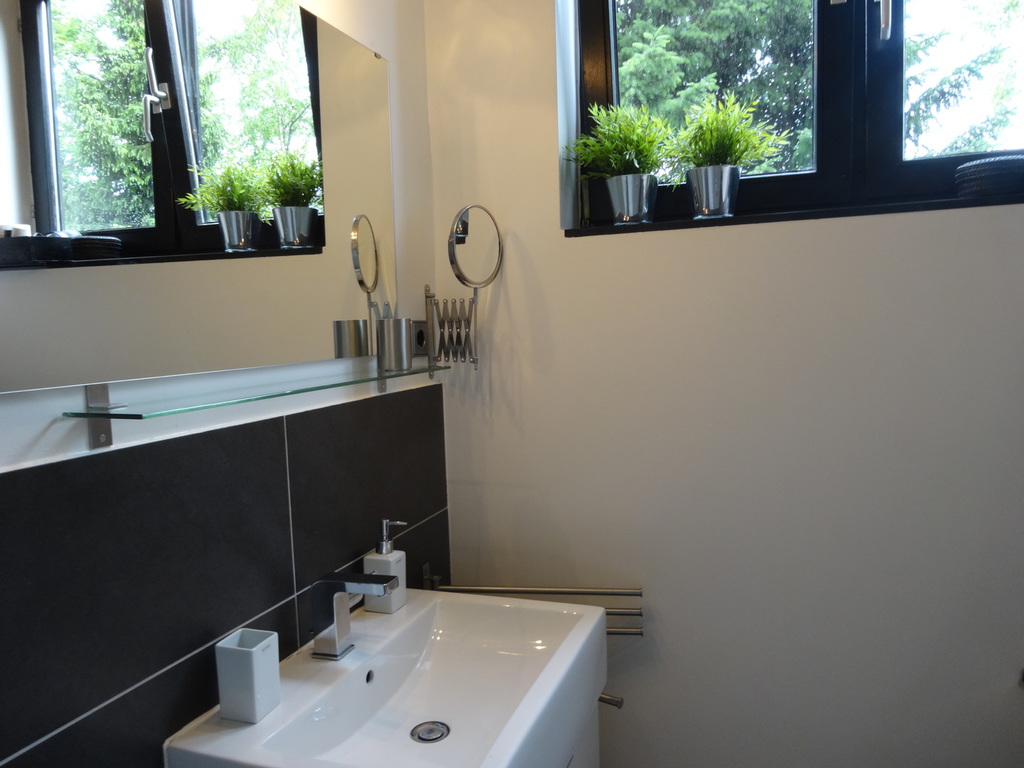 Das moderne Bad ist ausgestattet mit einer Glas/ Regendusche, WC, Waschbecken, Haartrockner und einem grossen Spiegel über dem Waschbecken.